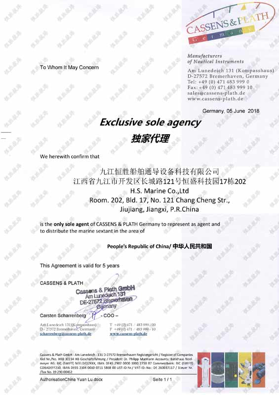 九江恒胜船舶通导设备科技有限公司为德国卡森.普拉特(Cassens & Plath)公司航海六分仪产品在中国大陆的唯一独家代理商。我公司销售的德国卡森普拉特航海六分仪产品为中国大陆地区正品行货,提供大陆地区质保和售后服务。